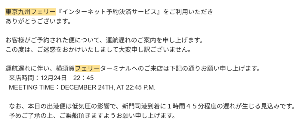 東京九州フェリー遅延の連絡は乗船日に届いた
